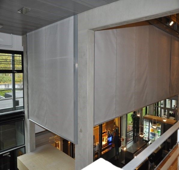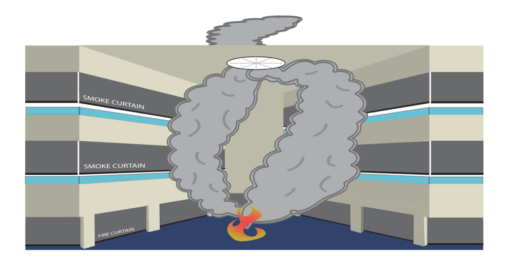 Atria create large open spaces that can be quickly engulfed in fire and smoke as it spreads from lower to upper levels. Spread of fire can be limited by fire curtains and smoke curtains can channel smoke to chimneys or extraction fans.